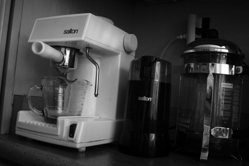 This thing makes my brain as a sharp as a knife! An old school Salton espresso machine found at Value Village for $8. Weeks later newer models from other manufacturers showed up on shelves. But I was happy with my purchase since the quality didn't seem as good for a higher price.