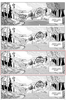 However after spending some time working with a system to speed up hatching - by basically placing a hatched image into the file as a layer, and then masking it to add and remove it from portions of the page - I discovered that it looked kind of poor when shown at a decent web size with a width of 800px. The hatching just created too many artifacts at that resolution, and these distortions were just too glaring for me. I then fooled around with line width some more and line spacing to see if it cleared it up. But there seemed to be always problems. I didn't want to make concessions on the hatching, which would look fine in print, but it looked like I would have to.
